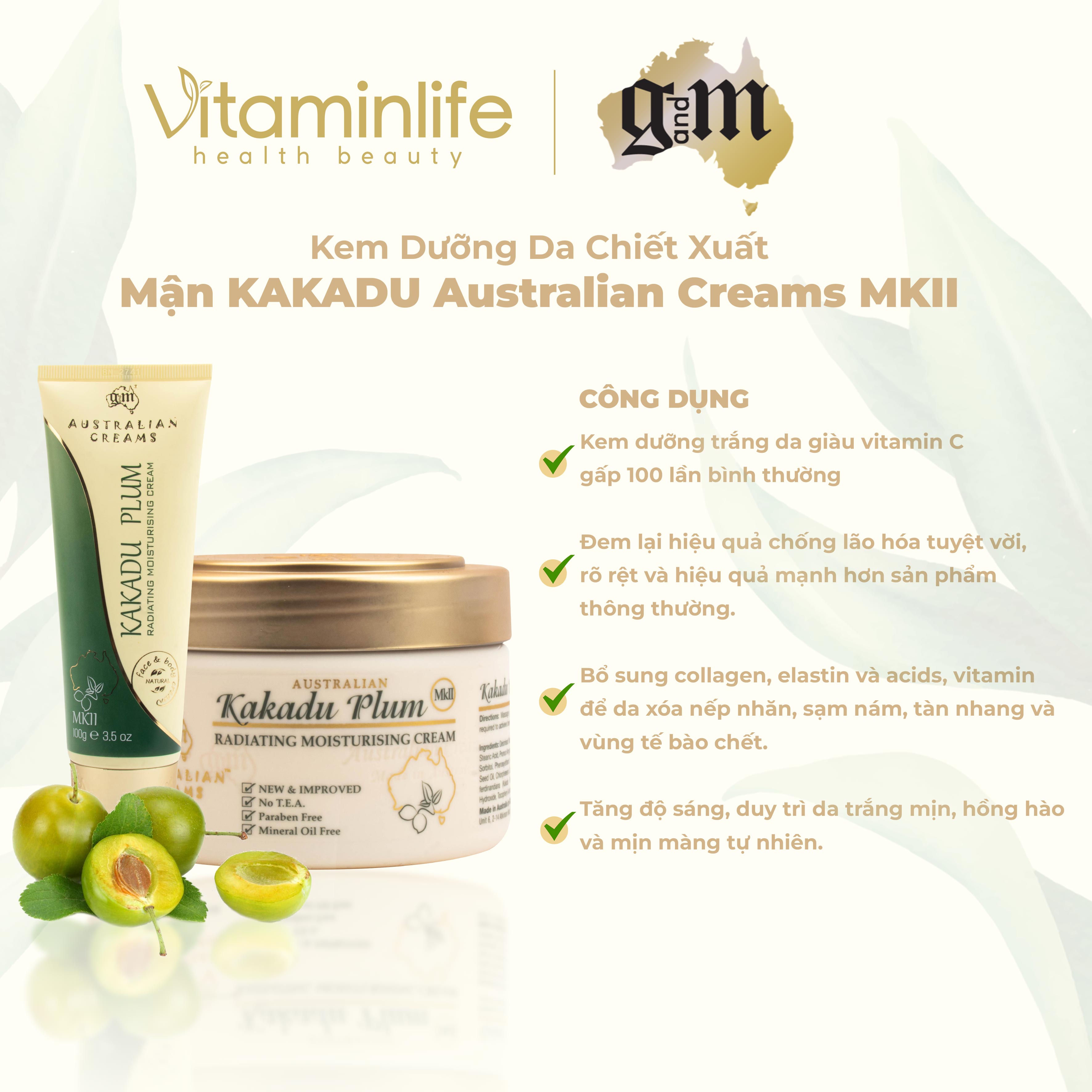 Kem dưỡng da chiết xuất từ Mận Kakadu Australian Creams MKII có kết cấu thẩm thấu nhanh, chống lão hóa mạnh mẽ, nhanh chóng xóa đi vùng da nám, sạm màu, trả lại làn da trắng sáng, hồng hào cho gương mặt. Cùng với sự kết hợp từ các tinh dầu tự nhiên như chiết xuất mận Kakadu Plum, dầu hoa hướng dương, dầu hạnh nhân giúp dưỡng ẩm cho da, mang lại làn da trắng sáng. Sản phẩm dùng cho da xỉn màu, da sạm và lão hóa.