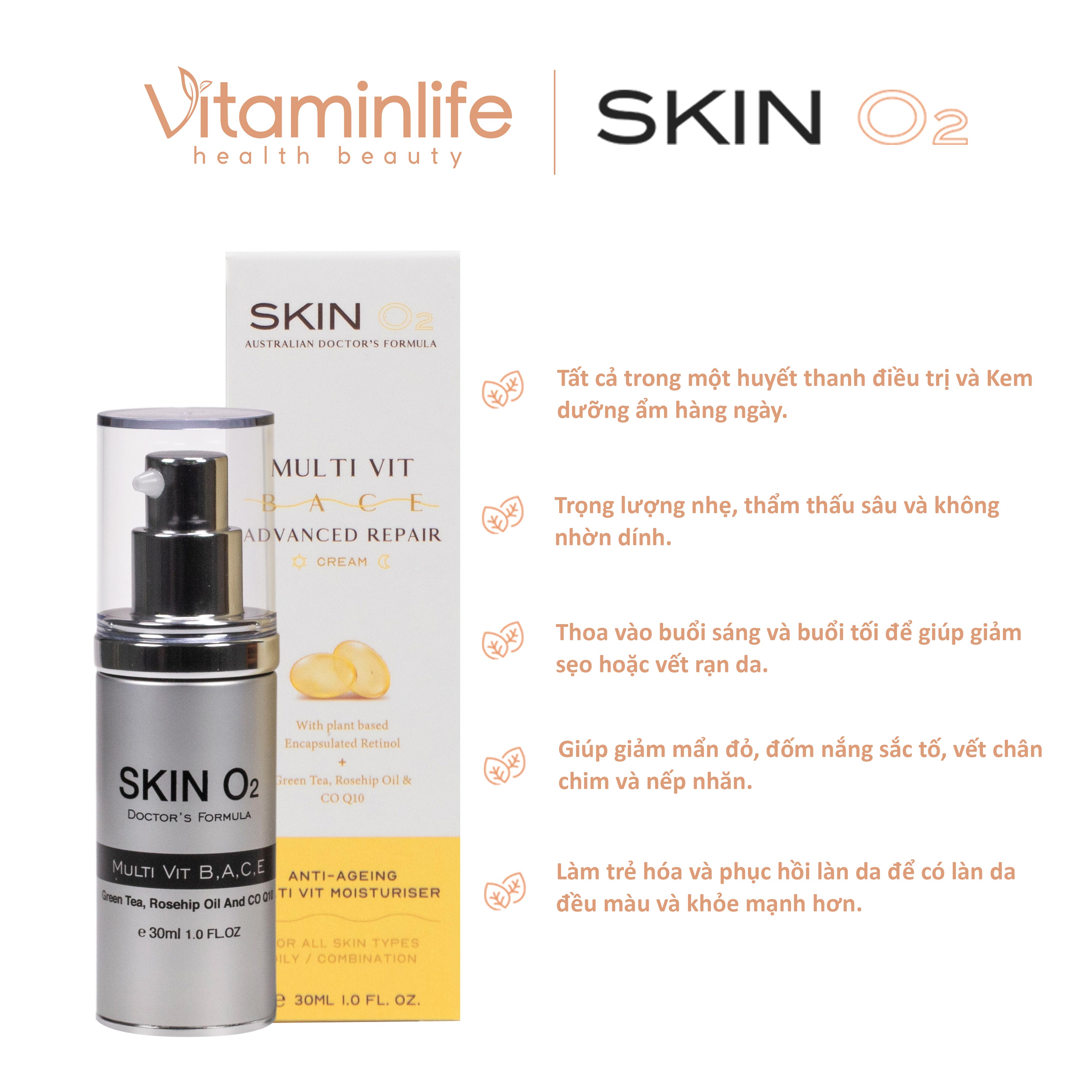 Kem dưỡng ẩm giàu Vitamin A,B,C,E Skin O2 được nghiên cứu với công thức đặc biệt giúp thẩm thấu nhanh và không gây bết dính. Thành phần trong kem có nguồn gốc thực vật như trà xanh, Dầu tầm xuân và CO Q10. Kem dưỡng ẩm giàu Vitamin A,B,C,E Skin O2 có công dụng dưỡng ẩm, trẻ hoá làn da và hỗ trợ làm giảm các vấn đề do tăng sắc tố da (nám, vết chân chim, sẹo…). Sản phẩm được chứng nhận thuần chay và không gây kích ứng cho da nhờ Retinol có trong sản phẩm.