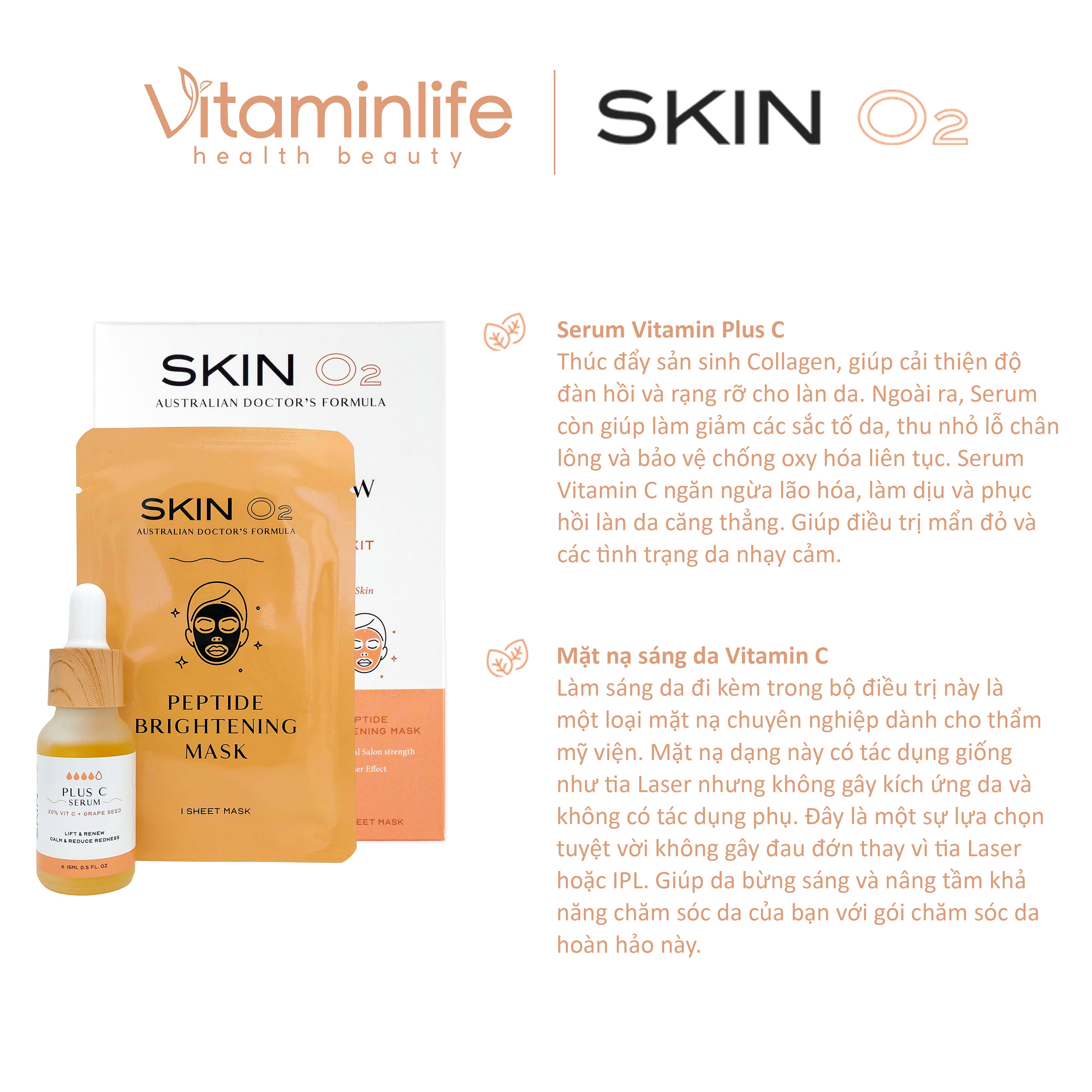 Bộ kit gồm 2 sản phẩm: Serum Vitamin C 15ml + Mặt nạ sáng da Vitamin C 32g Skin O2 với công thức gel cô đặc có tác dụng chống lão hóa cao, sản sinh Collagen và Elastin hỗ trợ làm đầy đặn và săn chắc da. Bên cạnh đó còn giúp tăng cường các thành mao mạch, giảm mẩn đỏ và hỗ trợ phục hồi da. Sản phẩm phù hợp cho bệnh Rosacea, da đỏ hoặc da nhạy cảm.