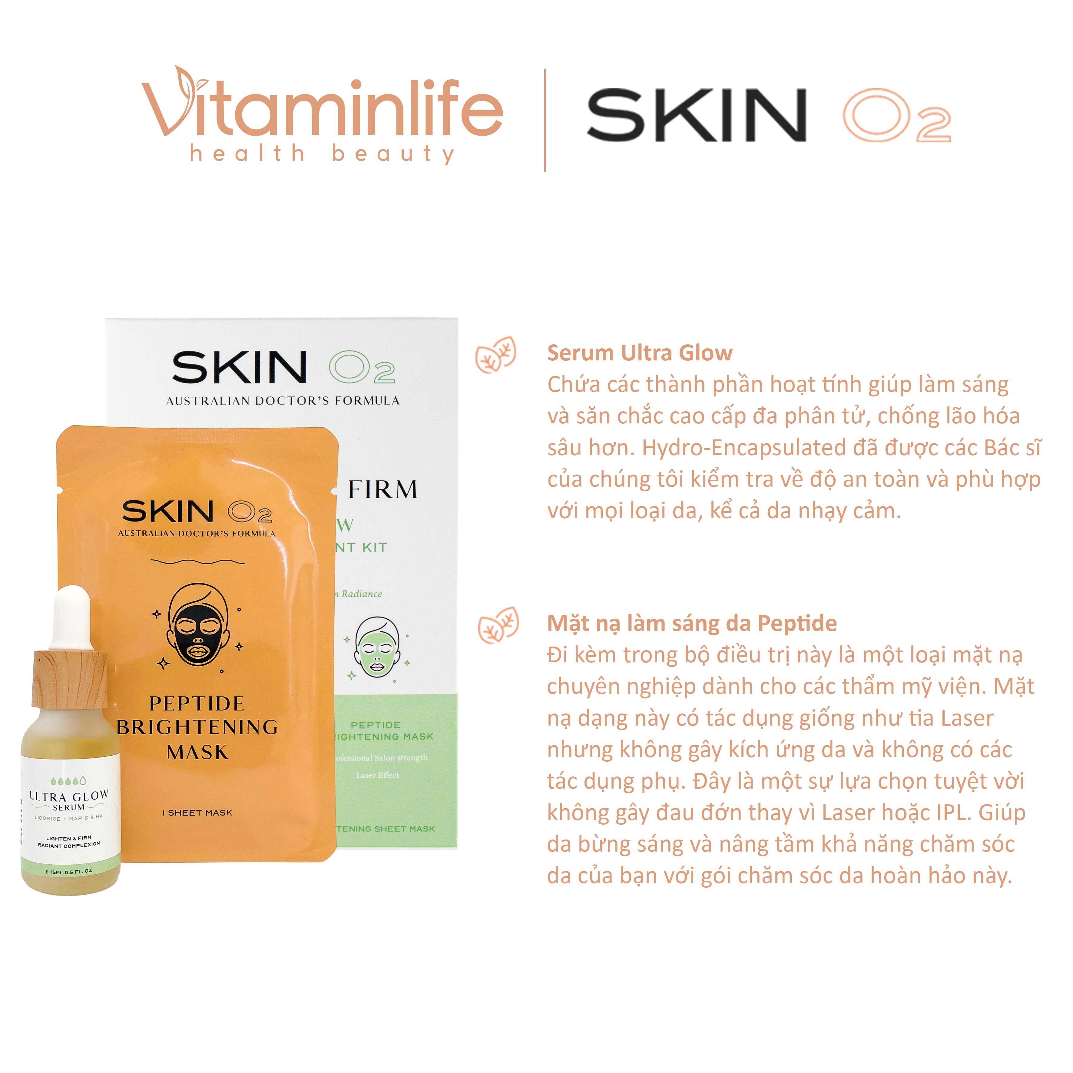 Serum Ultra Glow 15ml và Mặt nạ làm sáng da Peptide 32g Skin O2 hỗ trợ làm trắng và sáng da. Với công thức đậm đặc, làm sáng ngay lập tức để có một làn da sáng khỏe. Kết hợp cùng với chất ức chế hắc tố - giúp ngăn chặn sắc tố mới xuất hiện và làm mờ dần các đốm đồi mồi.