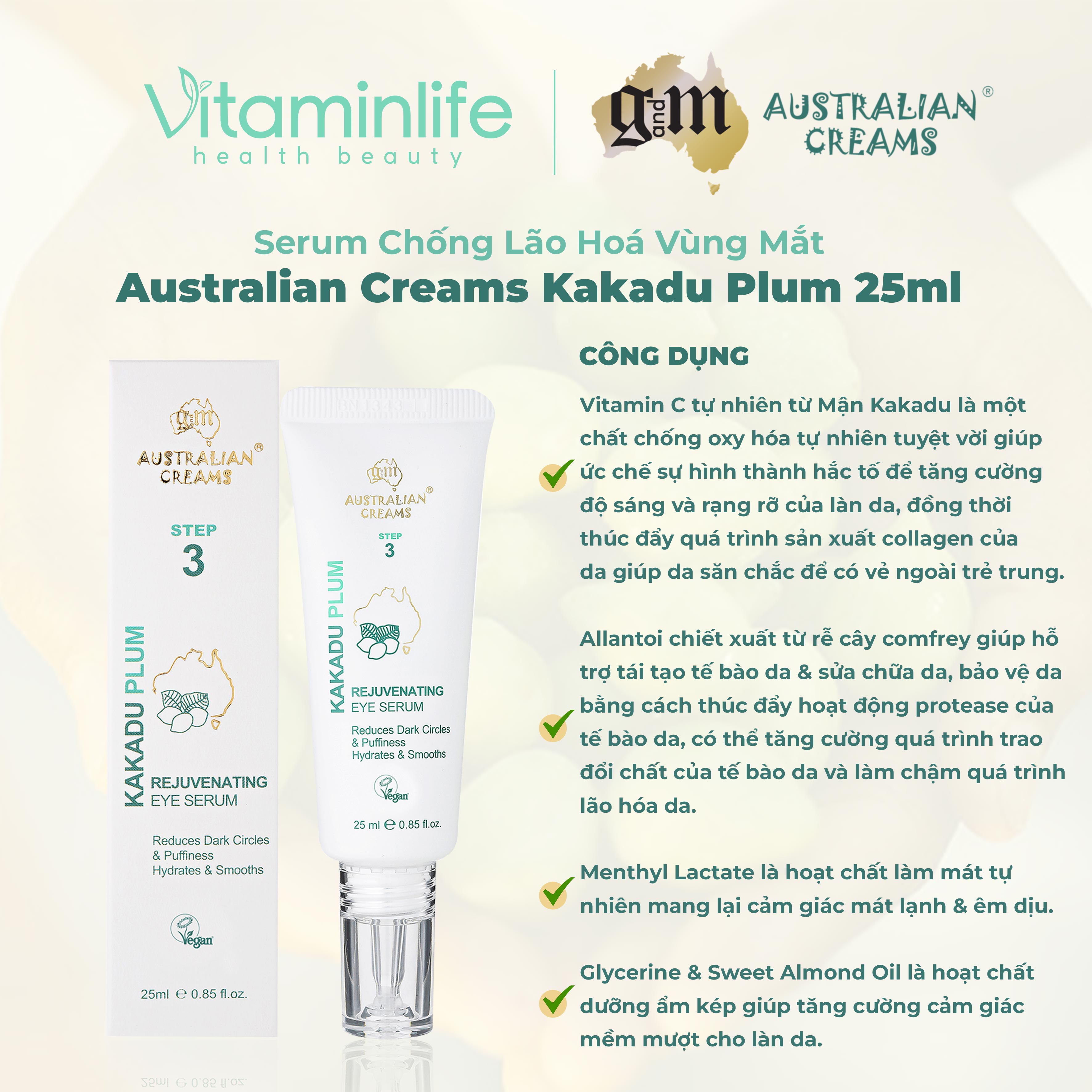Ngoài ra còn có Serum chống lão hoá vùng mắt Australian Creams Kakadu Plum 25ml đến từ thương hiệu G&M Cosmetis cũng là mỹ phẩm thuần chay có công dụng tương tự, chứa các thành phần dưỡng chất vô cùng chất lượng hỗ trợ cho việc cải thiện vùng da mắt cực kỳ tốt như: